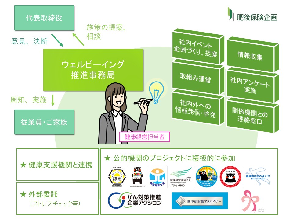 熊本市で保険代理店を営む肥後保険企画株式会社は、社長、取締役2名、従業員5名の計8名と小規模ながらも健康経営を積極的に推進。その活動をWebサイトでこまめに発信し、反響を得ている。現在の課題を解決していくだけではなく、事業の拡大や女性の活躍といった将来を見据えた施策にも力を入れている。その背景や具体的な実践方法、上手に進めていくためのポイントについて、健康経営担当者に話を聞いた。