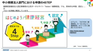 健康経営に関心はあるものの、何から始めればいいのか分からない、という企業向けに、申請フロー概要(4つのステップ)の案内がありました。