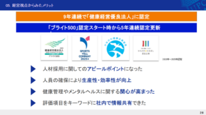 健康経営に取り組んだきっかけや、具体的な施策を紹介。トップダウンで健康経営を進めた結果、在籍中の従業員はもちろん、新卒採用においても変化があったなど、大きな効果があったことを強調しました。