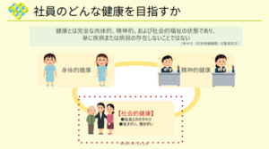 取り組みでは、まず代表がオンラインで健康経営の開始を社員に説明し、「従業員の家族も含めて幸せになってほしい」という強いメッセージを発信しました。続いて「社員がやりたいことをやろう」をコンセプトに、若手社員が中心となったプロジェクトチームを発足しました。