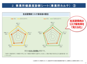 中小企業の多くは、「健康経営の必要性は感じているものの、何から始めればいいか、高度な取り組みが必要になるのではないか」という懸念をお持ちかと思います。そのような課題にむけて、健康宣言のハードルを下げ、どんな企業様であっても健康経営への取り組みを始められるような支援をしています。具体的には、各企業の健康状態を見える化した「事業所カルテ」の提供や、健康づくりに対する無料講座などを提供しています。ここ数年は特に、食生活の改善やメンタルヘルスに関する講座が好まれます。さまざまな「まずはここからやってみよう」を提供していますので、ぜひお問合せください。