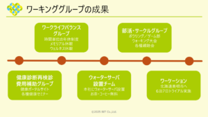 そこで若手社員でも発言しやすい雰囲気づくりを徹底し、社員の意見をもとに3つのワーキンググループを作りました。スポーツや親睦会で交流の場を設ける「部活・サークルグループ」、新しい働き方を策定・導入する「ワークライフバランスグループ」、健康診断再検診の受診を推進する「健康診断再検診費用補助グループ」です。